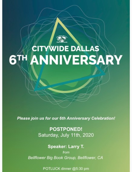 Larry T., the out-of-town anniversary speaker, has been rescheduled for July 11th. (Fingers-crossed that it will happen!)